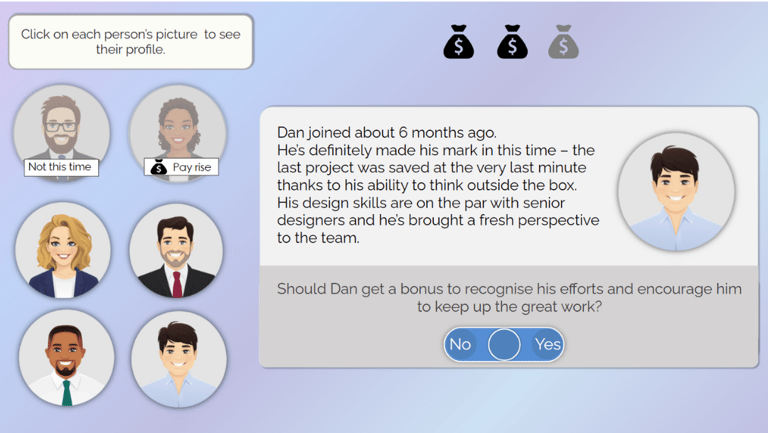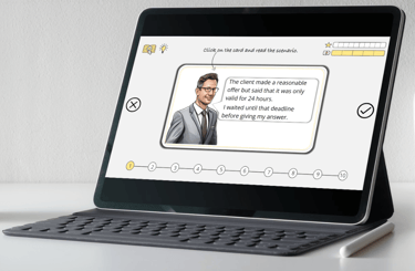 The part of the course presented in the preview is a game allowing learner to apply their knowledge about negotiations and evaluate the decisions presented to them. Game mechanics such as points, dynamic difficulty adjustment increase engagement. And the addition of game elements like power ups: hints and tutorials available for the learners whenever the need support boosts their motivation. Learners can re-take the game if they run out of “lives” or would like to improve their score. The element of chance here helps to maintain interest as the game is not going to be replayed in the same order as before. Instant feedback keeps learners hooked and makes the learning process effortless and instantaneous.