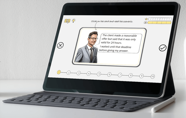 Counteroffers are introduced through a humorous video that makes this pretty serious concept accessible to learners gets them interested in the topic. An open-ended situation stimulates prior knowledge recall and encourages learners to stipulate about the reasons leading to the outcome they’ve seen. Elements of storytelling, including a cliffhanger between the two videos, hook the learners and motivate them to keep digging deeper. As the course is set in the context familiar to the learners and features real-life examples and practical tasks there is clear value of engaging with the content.